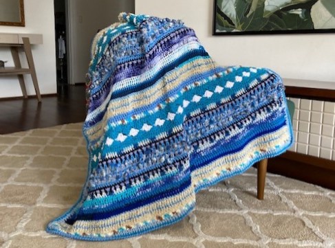 Esta em tons de azul com linhas de diversas texturas. Quase totalmente em pontos altos. O efeito dá-se pela mudança de cores e texturas.
