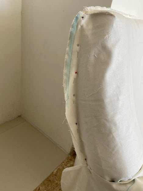 Depois de riscado eu cortei e costurei. Daí vesti na poltrona para fazer os ajustes. E foram muitos. Preferi deixar sobrando e fazer os ajustes porque se ficar menor não tem jeito. Alfinetei e refis as costuras até dar certo.